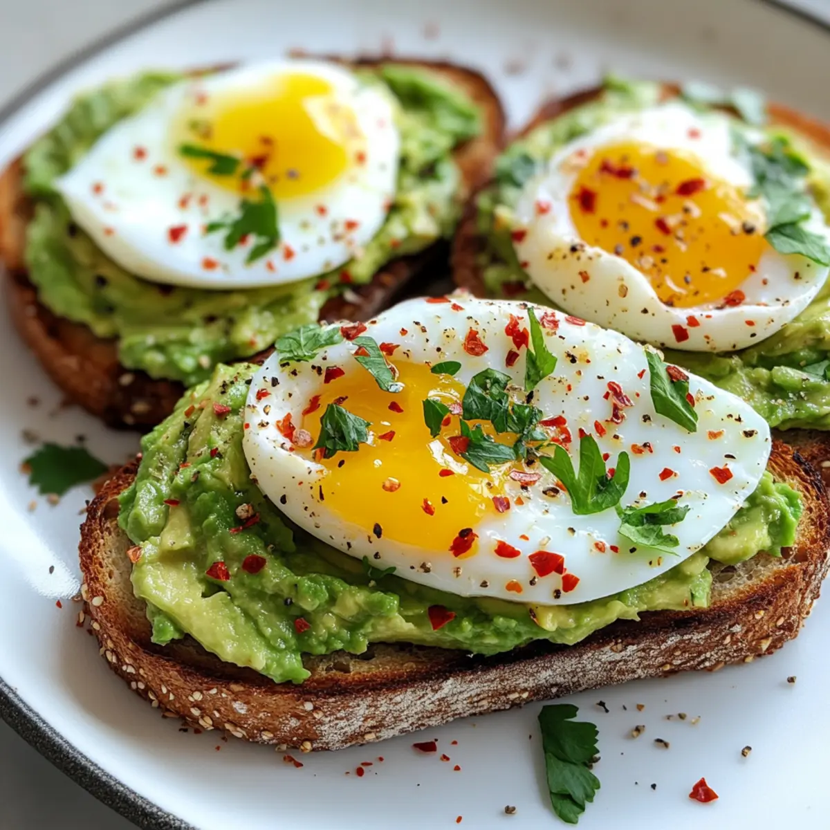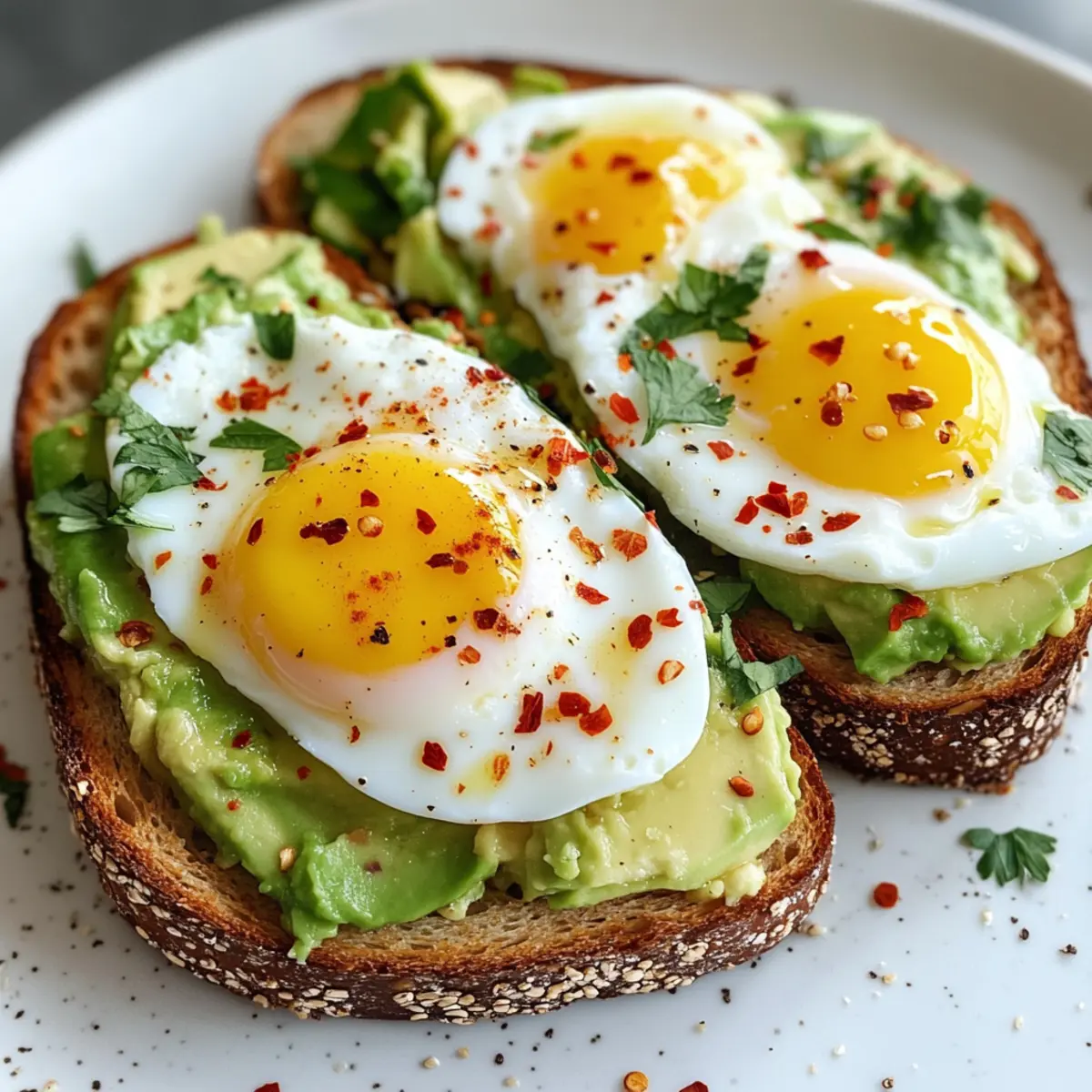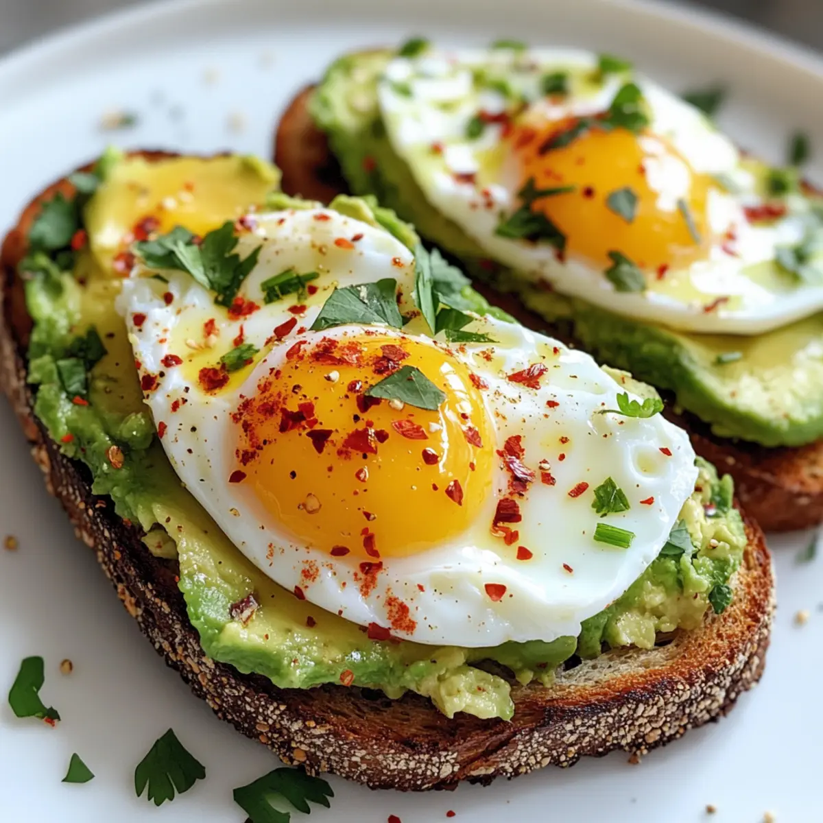 - Falls gewünscht, streue etwas rote Pfefferflocken über die Eier und dekoriere den Avocado-Ei-Toast mit frischen Kräutern.
