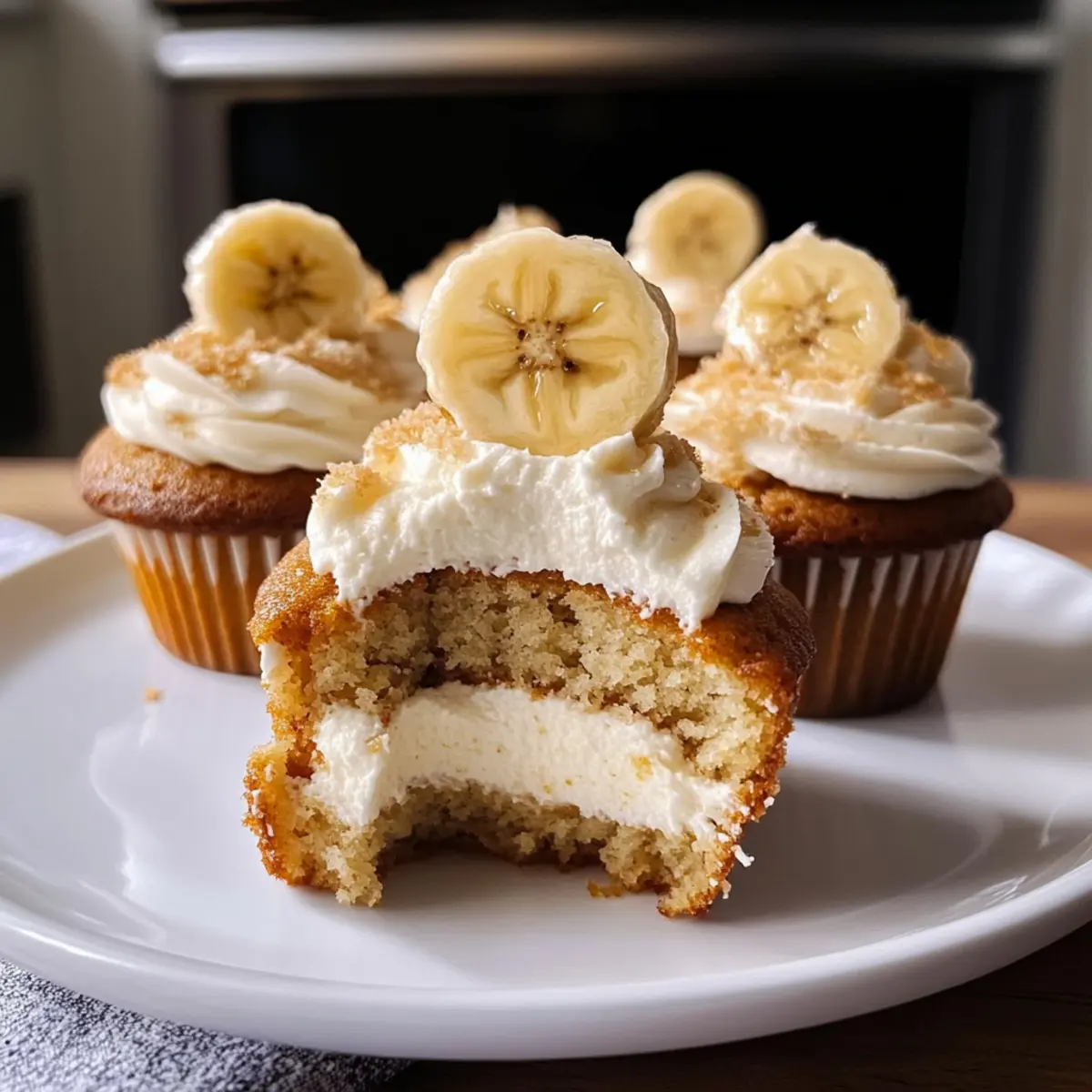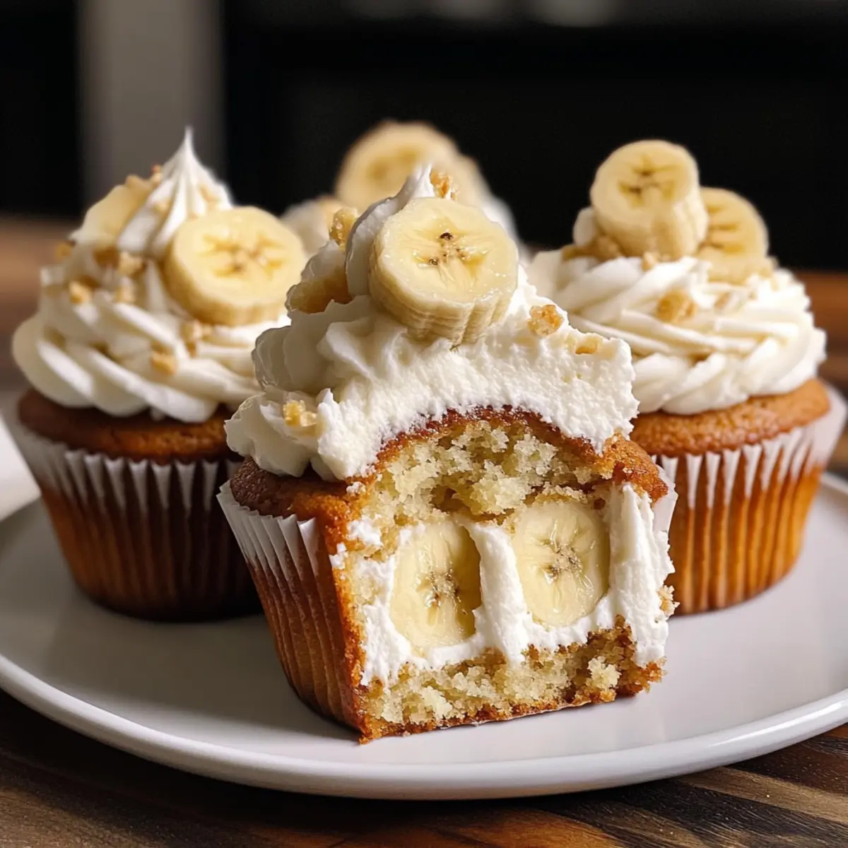 - Spritze das Frischkäse-Topping dekorativ auf die abgekühlten Cupcakes und garniere sie mit Bananenscheiben und Walnüssen.