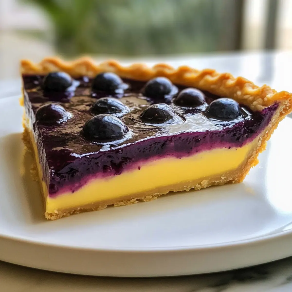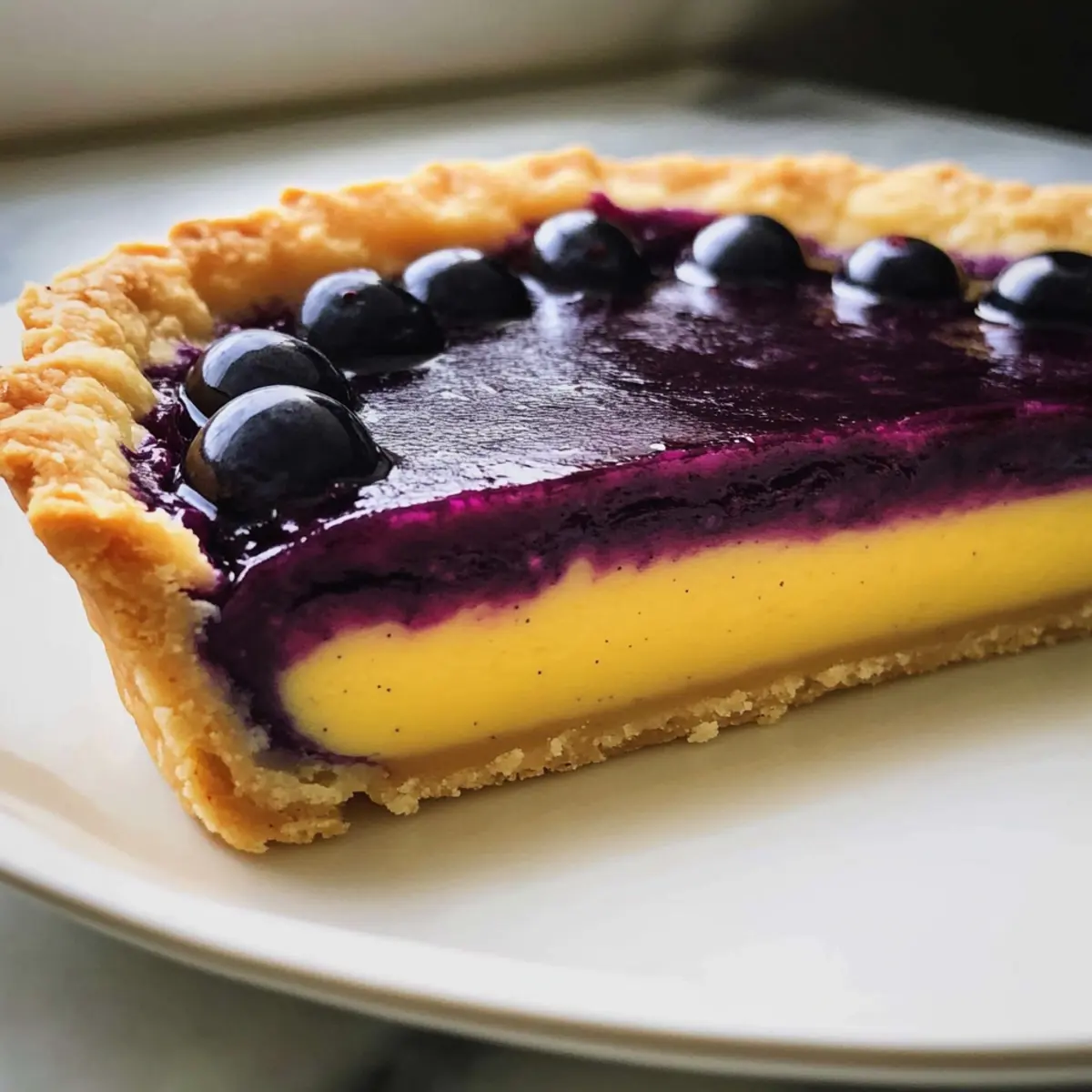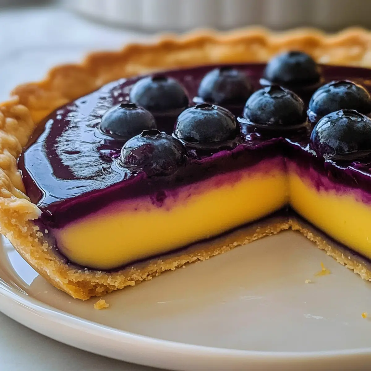 - Gießen Sie die abgekühlte Blaubeerschicht vorsichtig über die Zitronencreme. Kühlen Sie die gesamte Tarte für mindestens 2 Stunden im Kühlschrank, bis die Blaubeerschicht fest ist.