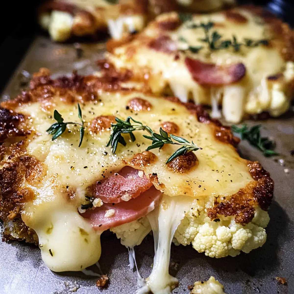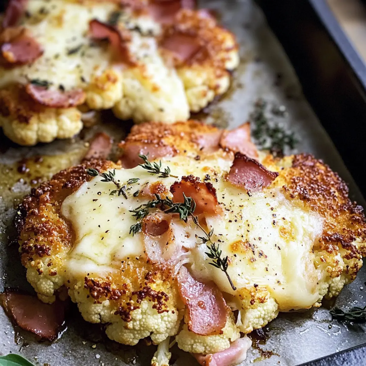 Nimm das Blech aus dem Ofen und verteile eine großzügige Menge Tomatensoße auf jeder Blumenkohlscheibe. Lege dann den Schinken gleichmäßig darauf und streue die geriebene Käsemenge nach deinem Geschmack darüber. Dieser Schritt verleiht dem Blumenkohlschnitzel aus dem Backofen seinen herzhaften Charakter.