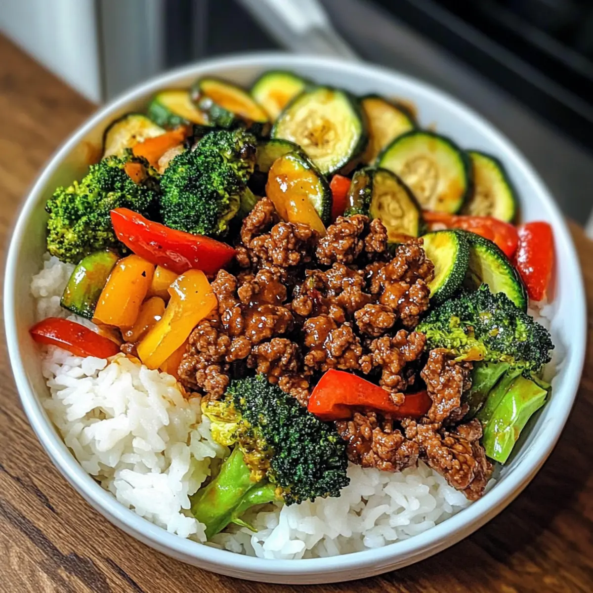 Scharfe Rinderhackfleisch-Pfanne mit Gemüse und Reis