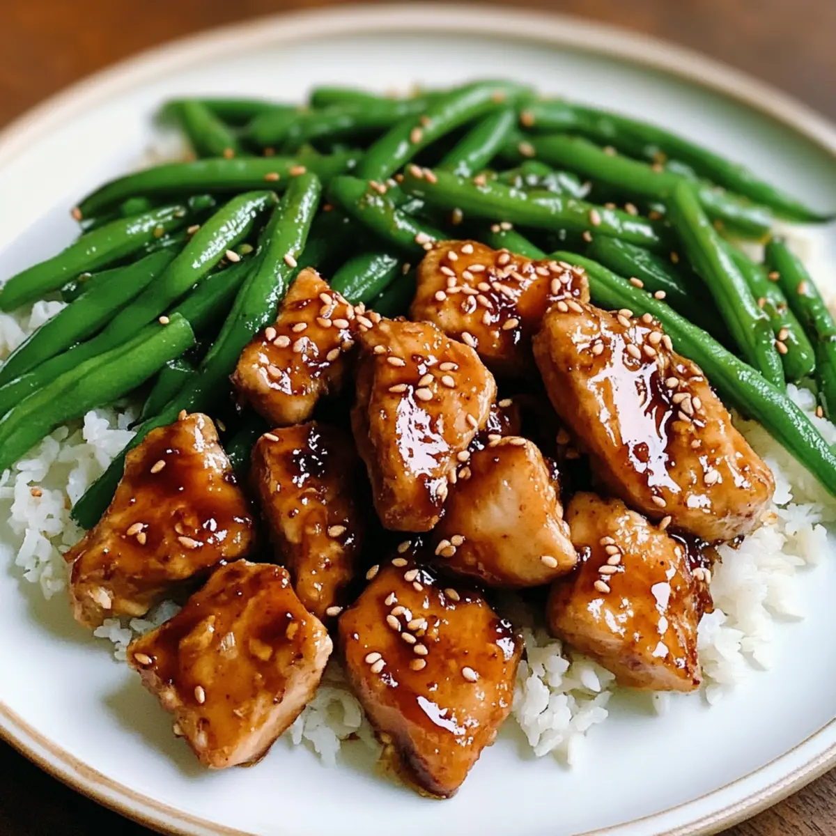 Klebriges Soja-Hühnchen mit Sesam-Grünen Bohnen für Eilige