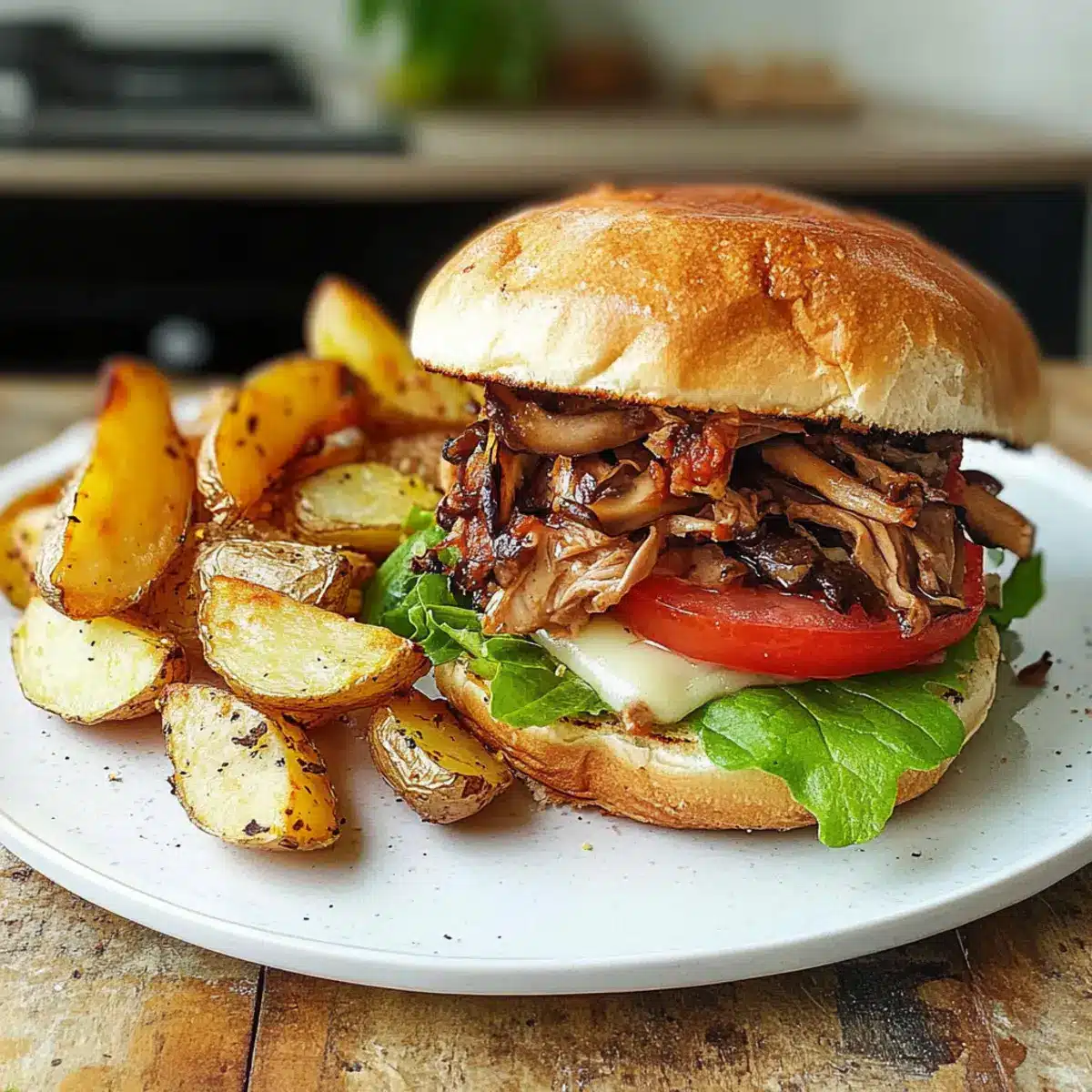 Zerissener Pilz-Burger mit Ofenkartoffeln geniessen