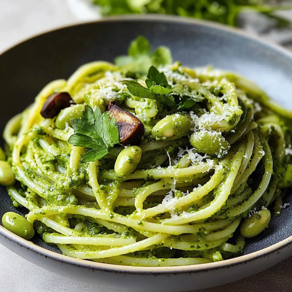 Spaghetti mit Edamame-Pesto für schnelles Kochen