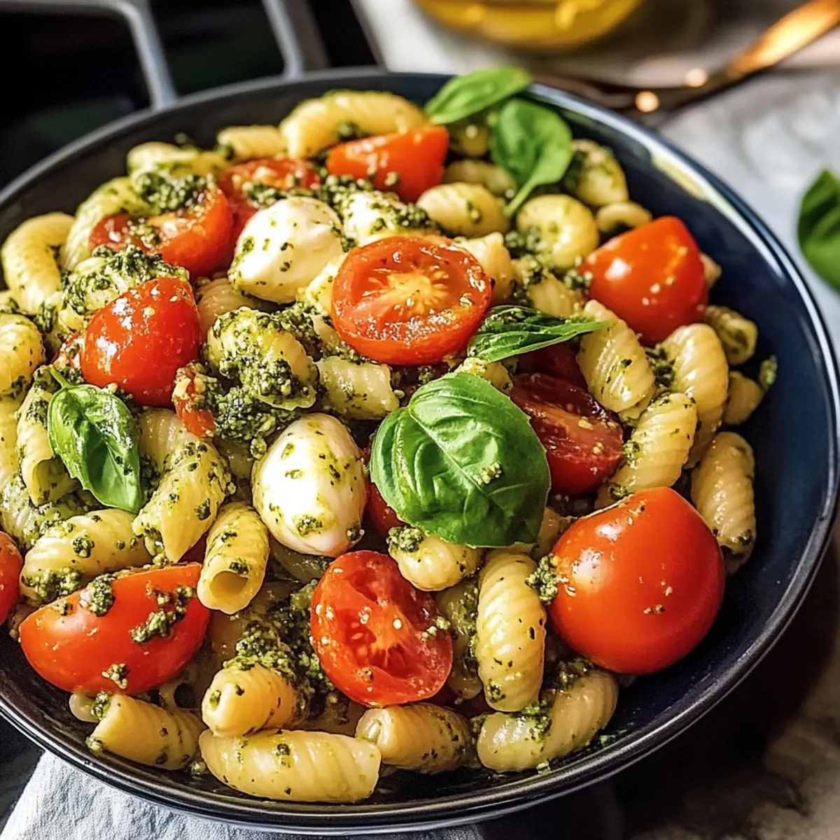 Gesunder Nudelsalat mit Tomaten und Pesto genießen