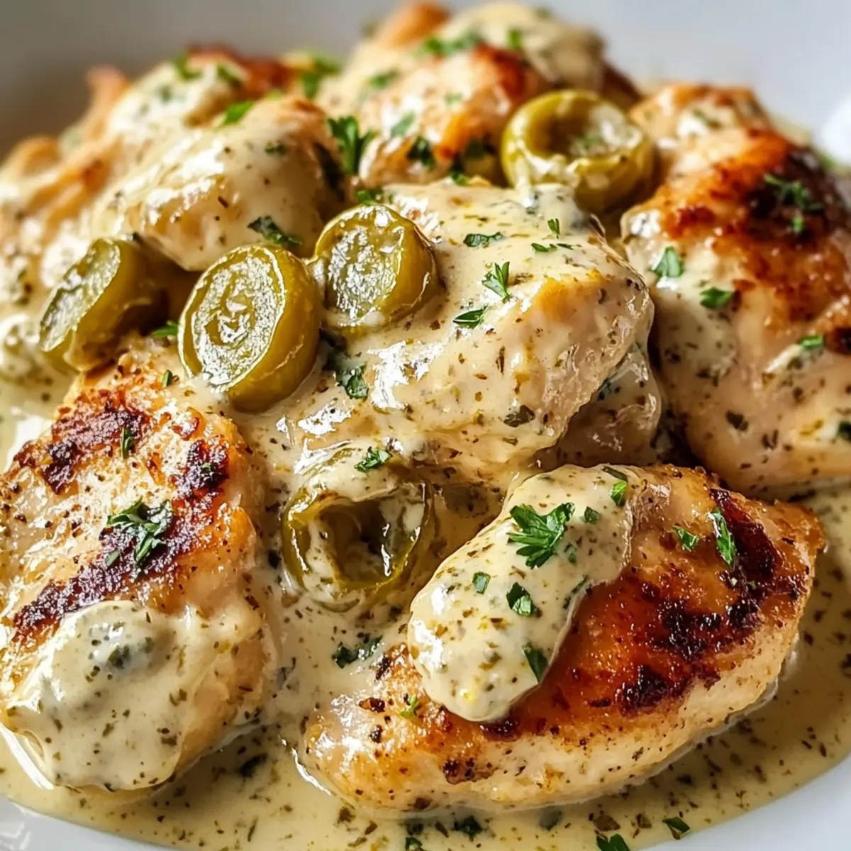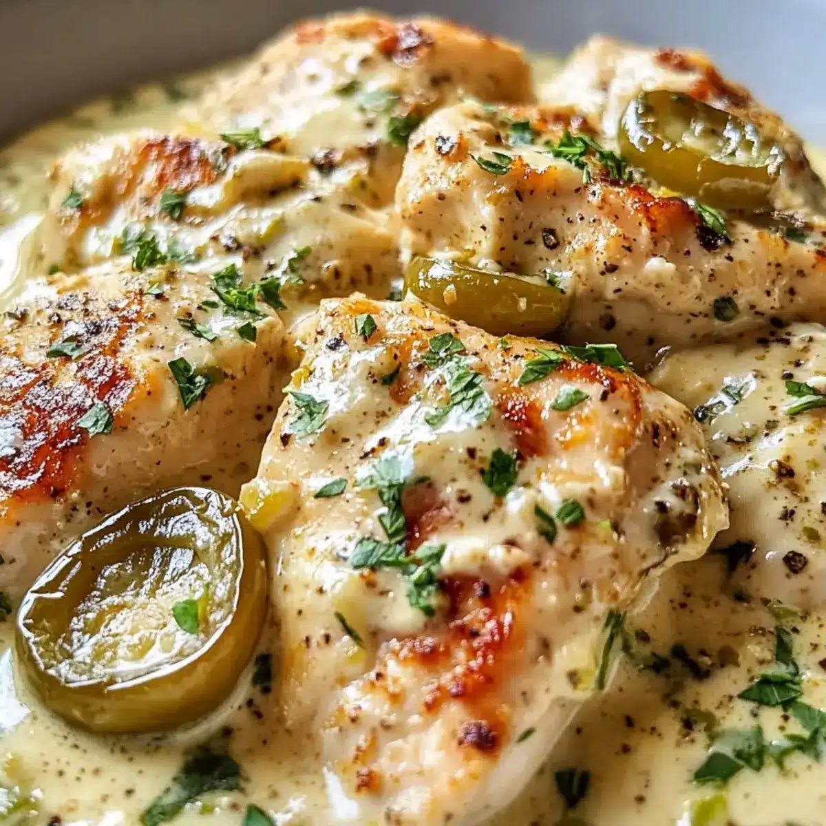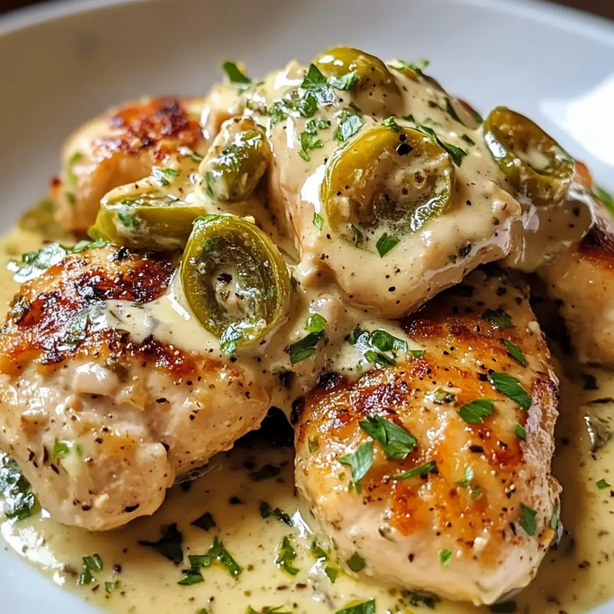 - Servieren Sie das Cremige Pepperoncini-Hühnchen direkt aus der Pfanne, großzügig mit der Sauce darüber. Garnieren Sie mit frischer Petersilie.