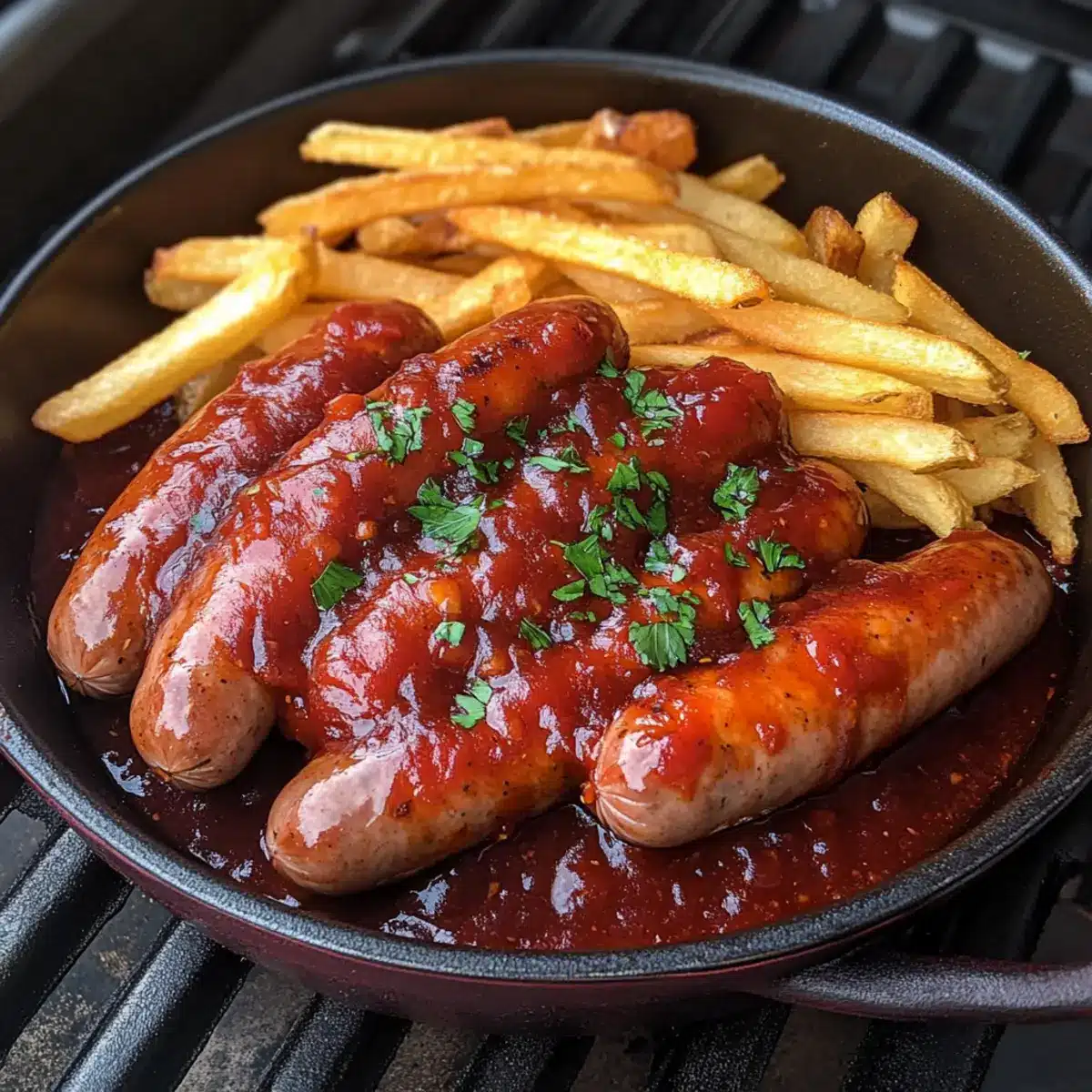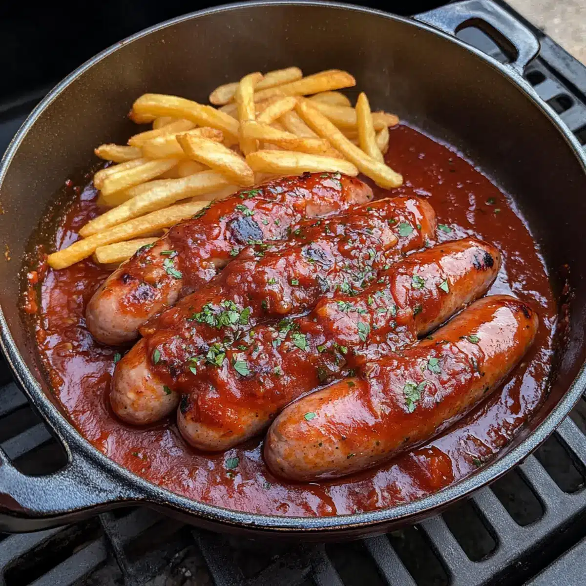 Indirekte Hitze: Beim Grillen, stelle sicher, dass die Currywurst Soße nicht direkt über der Flamme steht – dies sorgt für eine gleichmäßige Erwärmung und intensives Raucharoma.