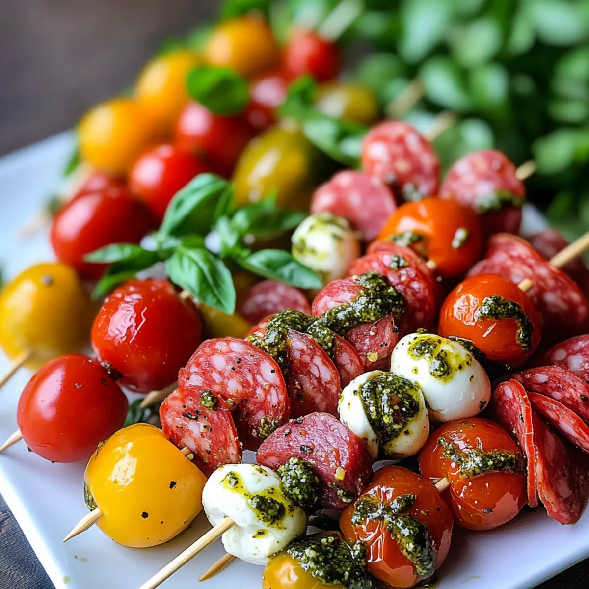 - Kurz vor dem Servieren Pesto auf jeden Spieß geben oder über die Zutaten pinseln.