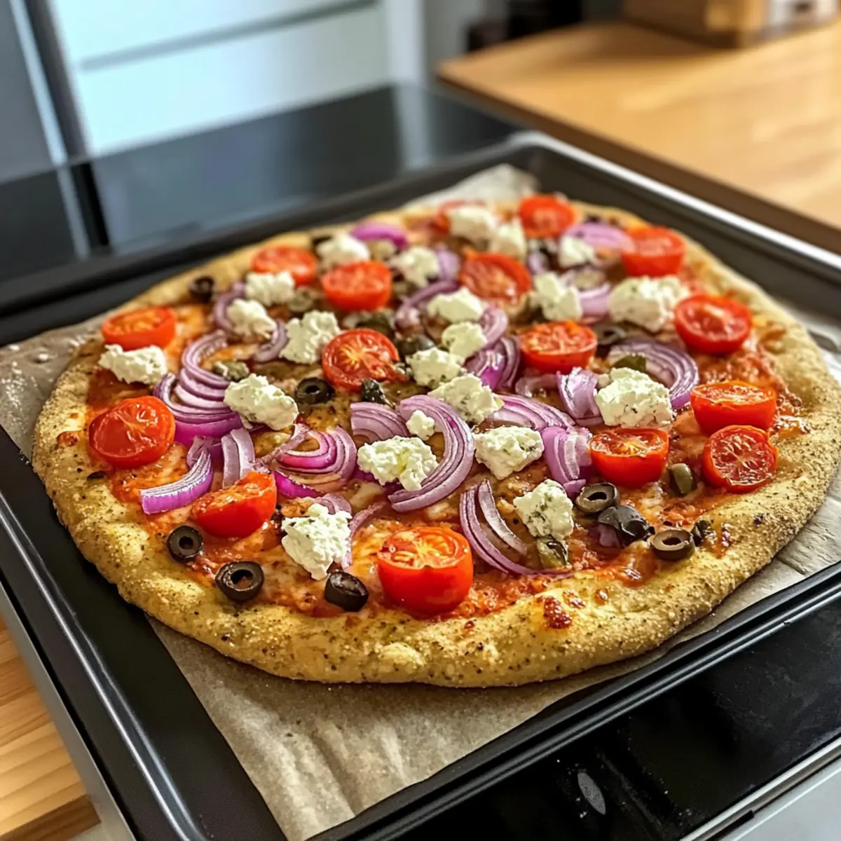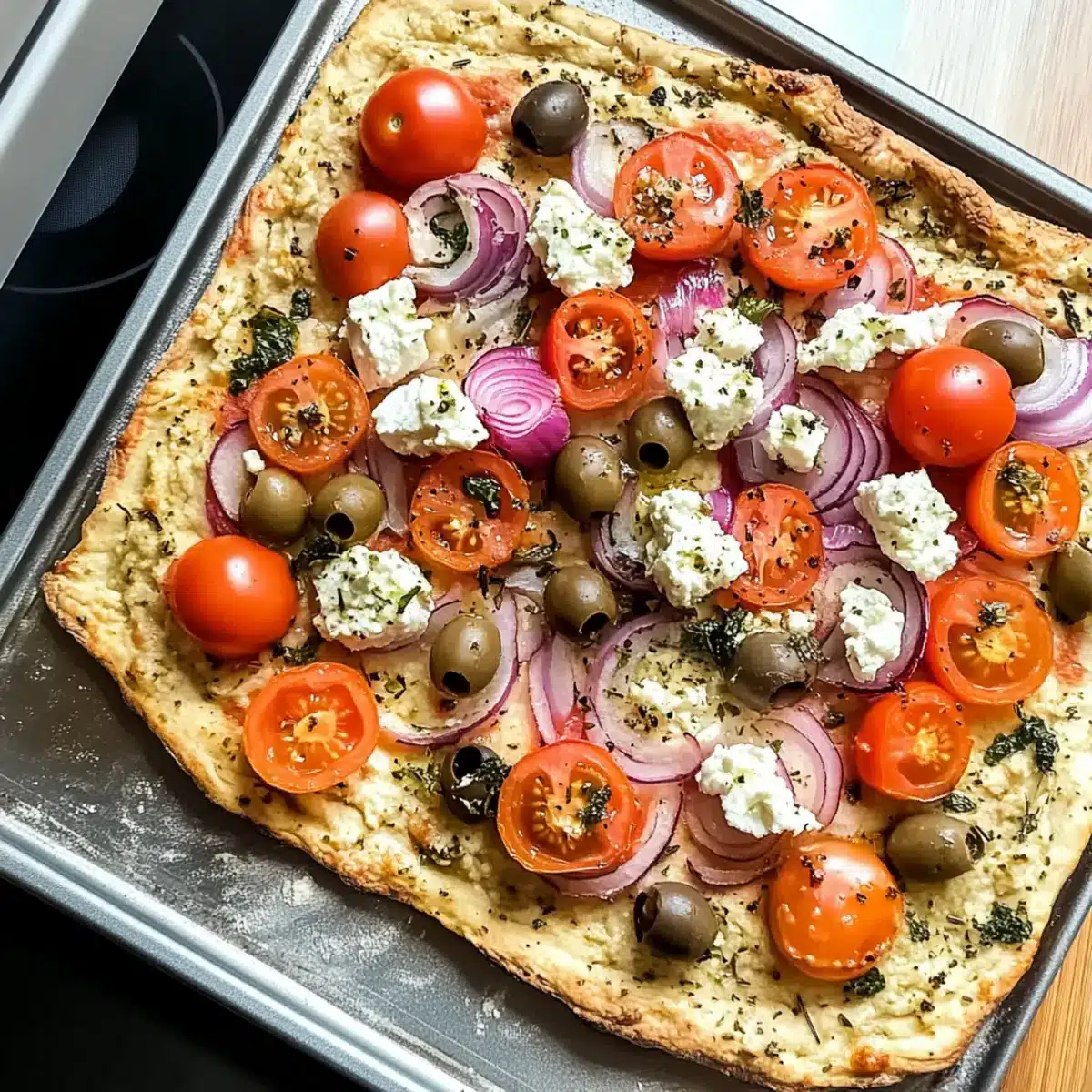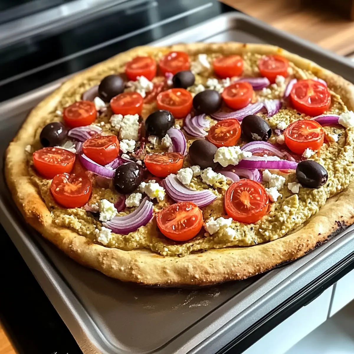 Einfache Hummus Pizza mit veganem Feta für jeden Tag
