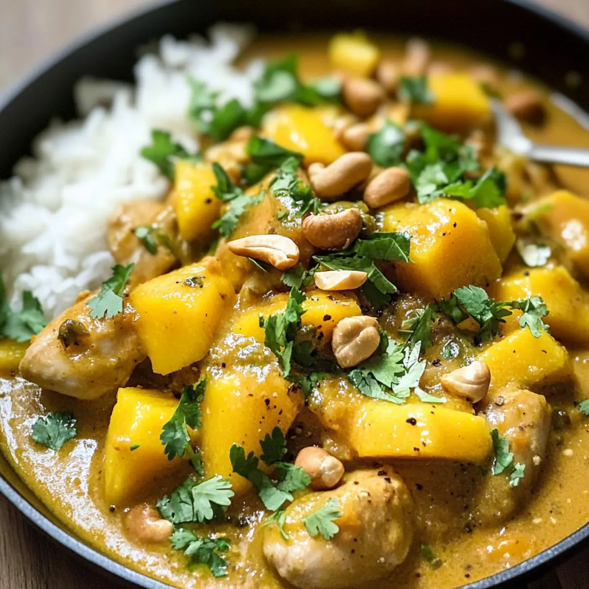 Rühre gelegentlich um und lasse das Fruchtige Hähnchen Mango Curry weiter für zusätzliche 10 Minuten köcheln, um die gewünschten Aromen zu intensivieren. Die Sauce sollte langsam eindicken und eine cremige Konsistenz erreichen. Serviere das Curry großzügig mit gerösteten Cashewkernen und frischem Koriander über einer Portion Reis.