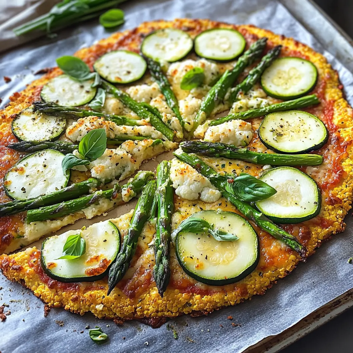 Nimm die fertige Blumenkohl-Pizza mit grünem Spargel aus dem Ofen, lass sie kurz abkühlen und garniere sie mit frischem Basilikum. Schneide die Pizza in Stücke und serviere sie warm, um das volle Geschmackserlebnis zu genießen.