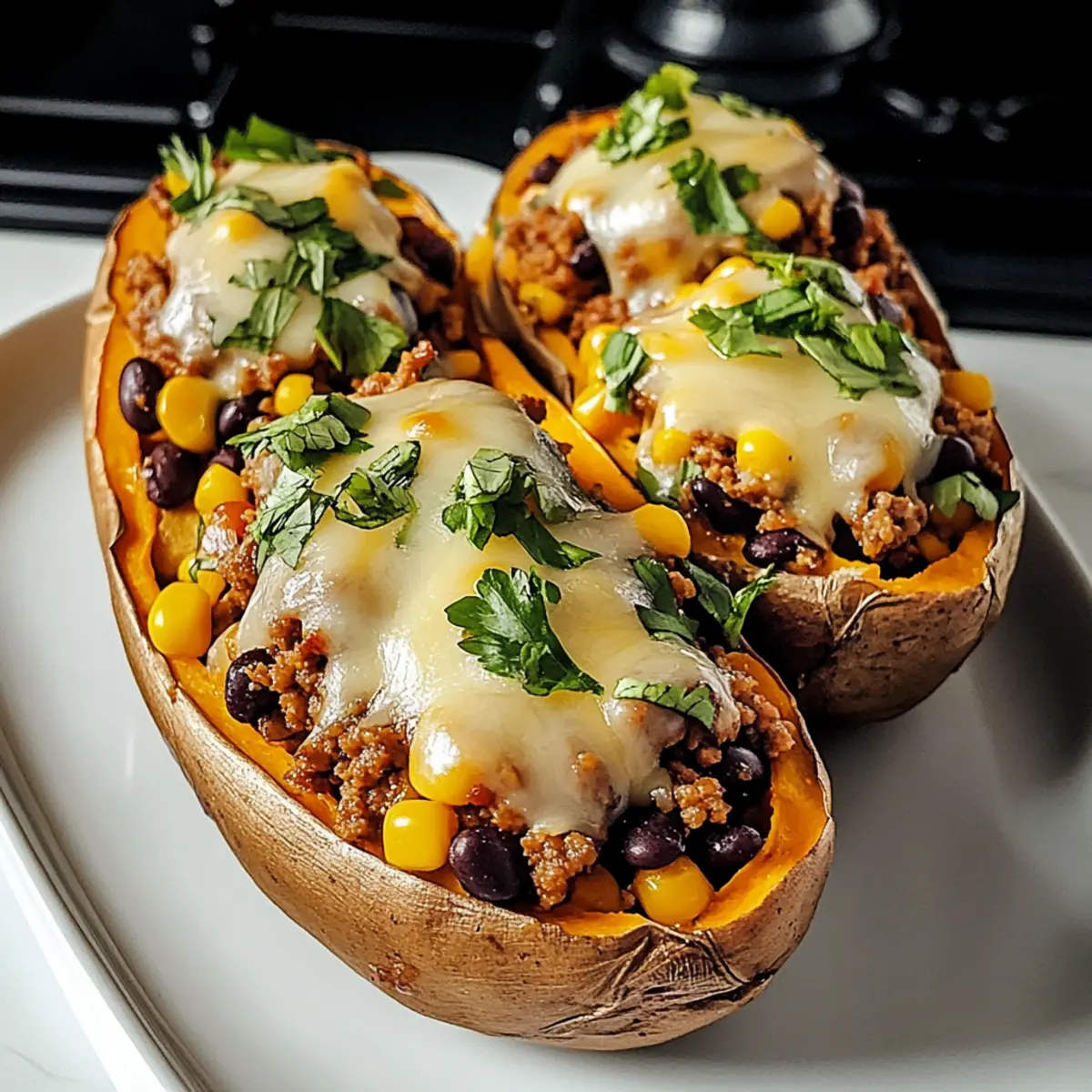 - Garniere die gefüllten Süßkartoffeln nach Wunsch und serviere sie warm.