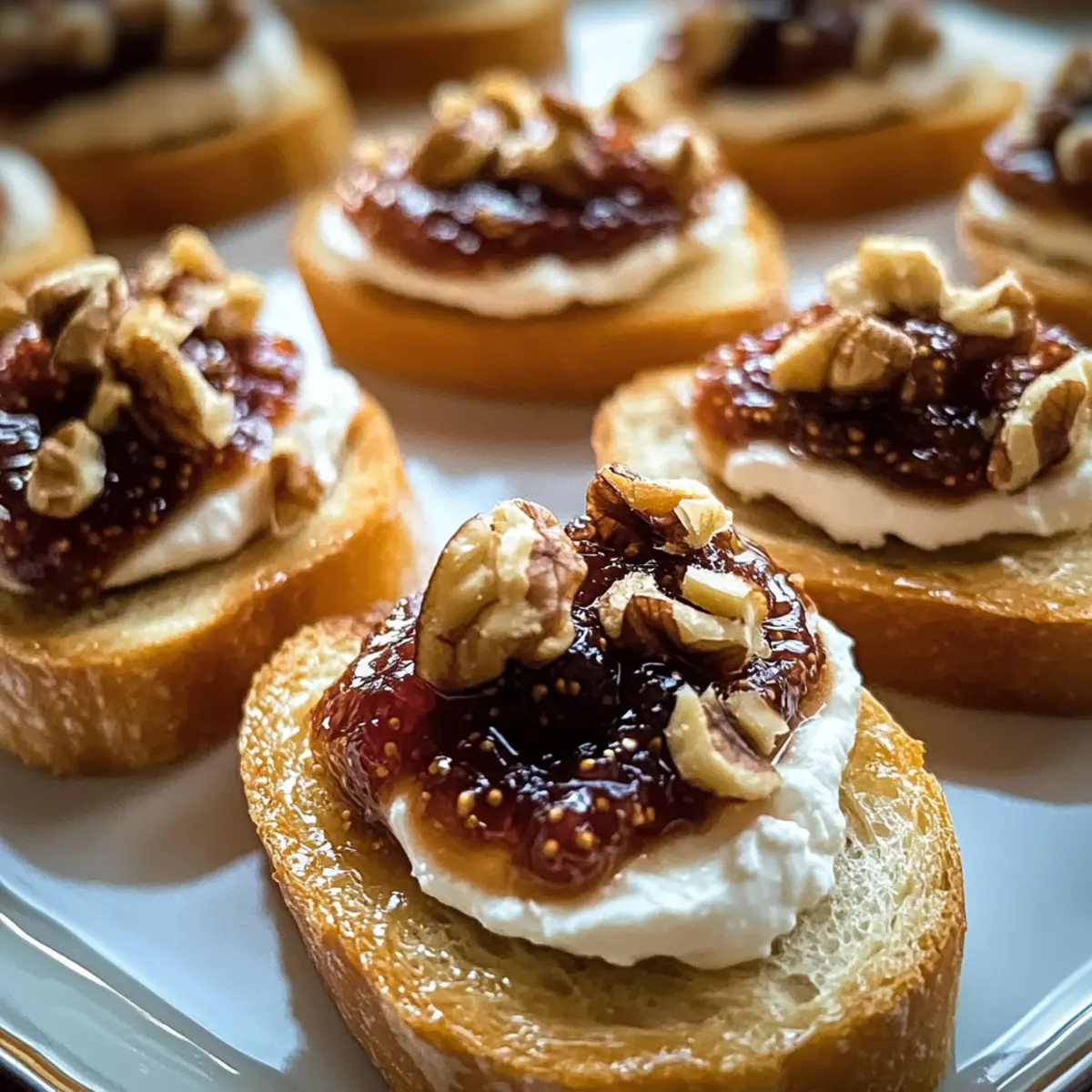 Toppen Sie jede mit Ziegenkäse bestrichene Crostini mit einem Klecks von ½ Tasse Feigenmarmelade. Lassen Sie die Marmelade leicht über den Ziegenkäse laufen, um eine ansprechende Präsentation zu erzielen. Diese süße Komponente kreiert einen köstlichen Kontrast zum cremigen Käse.