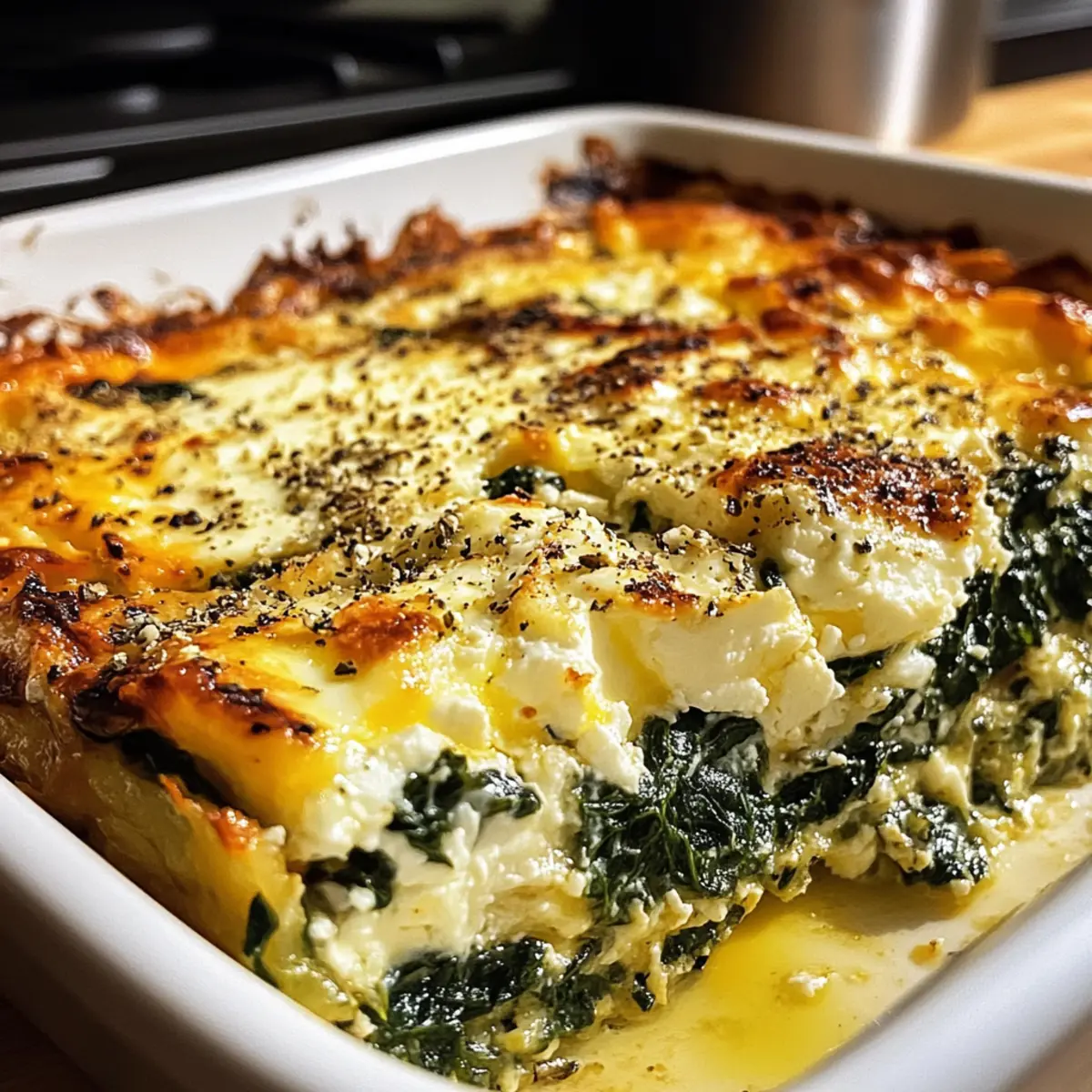 Würzige Note: Füge eine Prise Cayennepfeffer oder Paprika hinzu, um dem Auflauf einen leckeren Kick zu verleihen. Die Schärfe passt hervorragend zu den milden Aromen von Spinat und Feta.