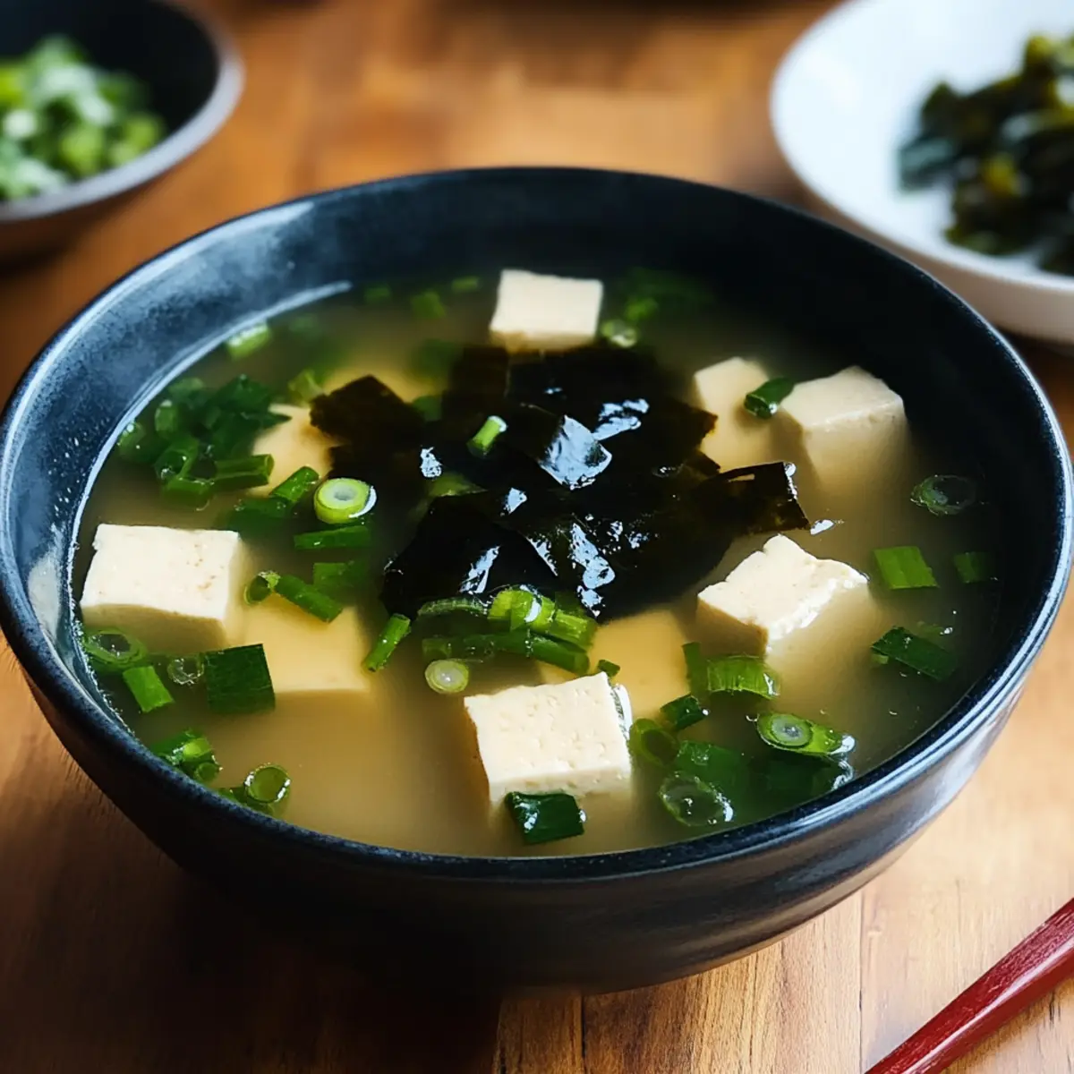 Wakame-Hinweis: Rehydriere getrocknete Wakame vorher in warmem Wasser, damit sie optimalen Geschmack und Textur in deiner Miso-Suppe entwickelt.