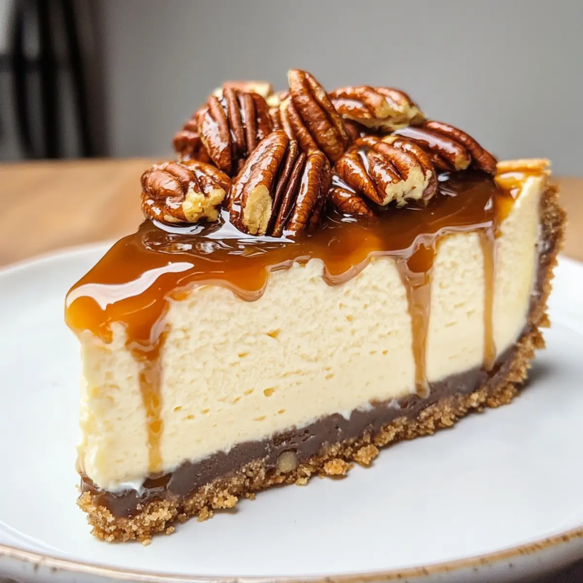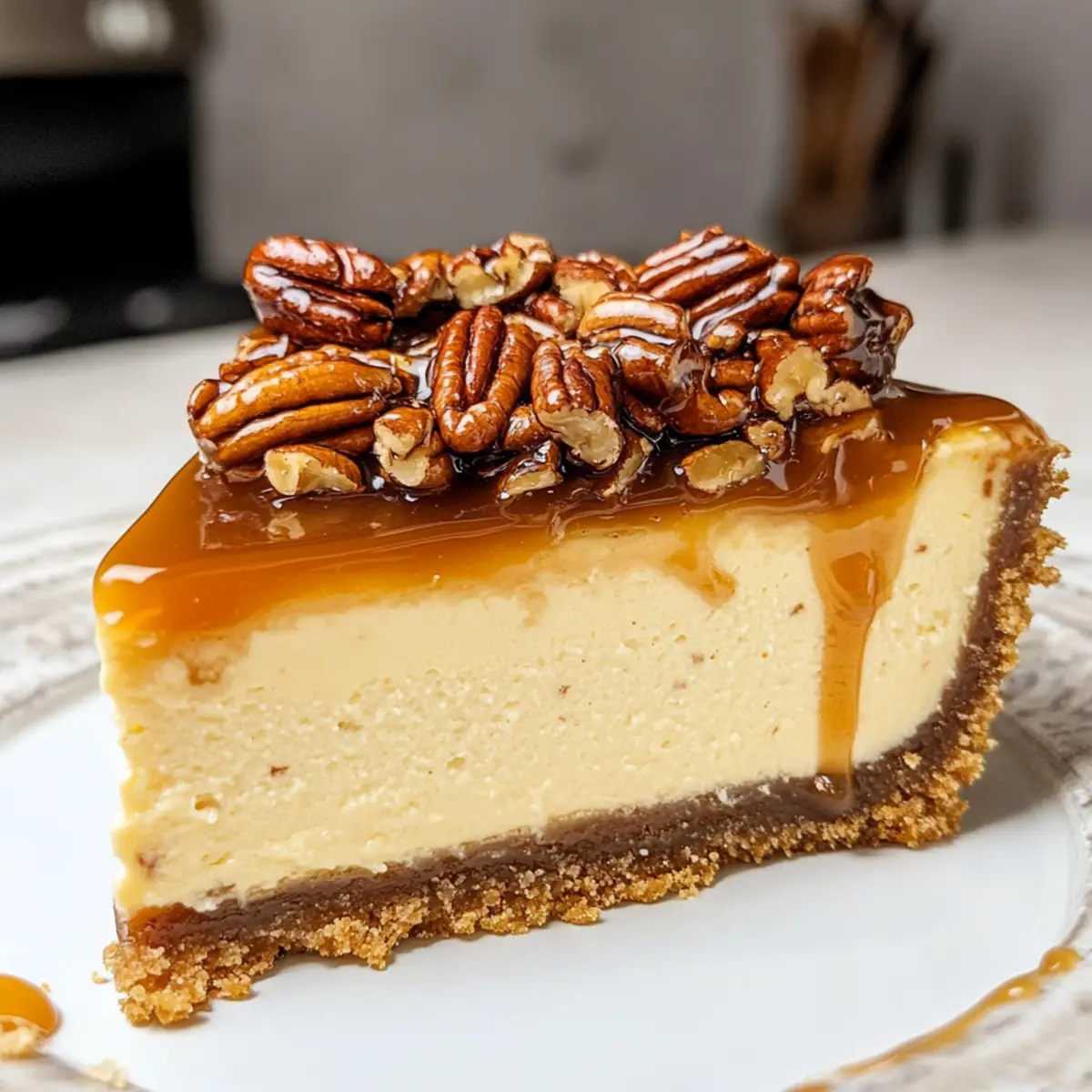 Lasse das Karamell kurz abkühlen, bevor du es gleichmäßig über den gekühlten Pekannusskuchen Käsekuchen gießt. Verteile das Karamell gleichmäßig, damit es gut an der Füllung haftet, und lasse es einige Minuten setzen, bevor du den Kuchen in Stücke schneidest und servierst.