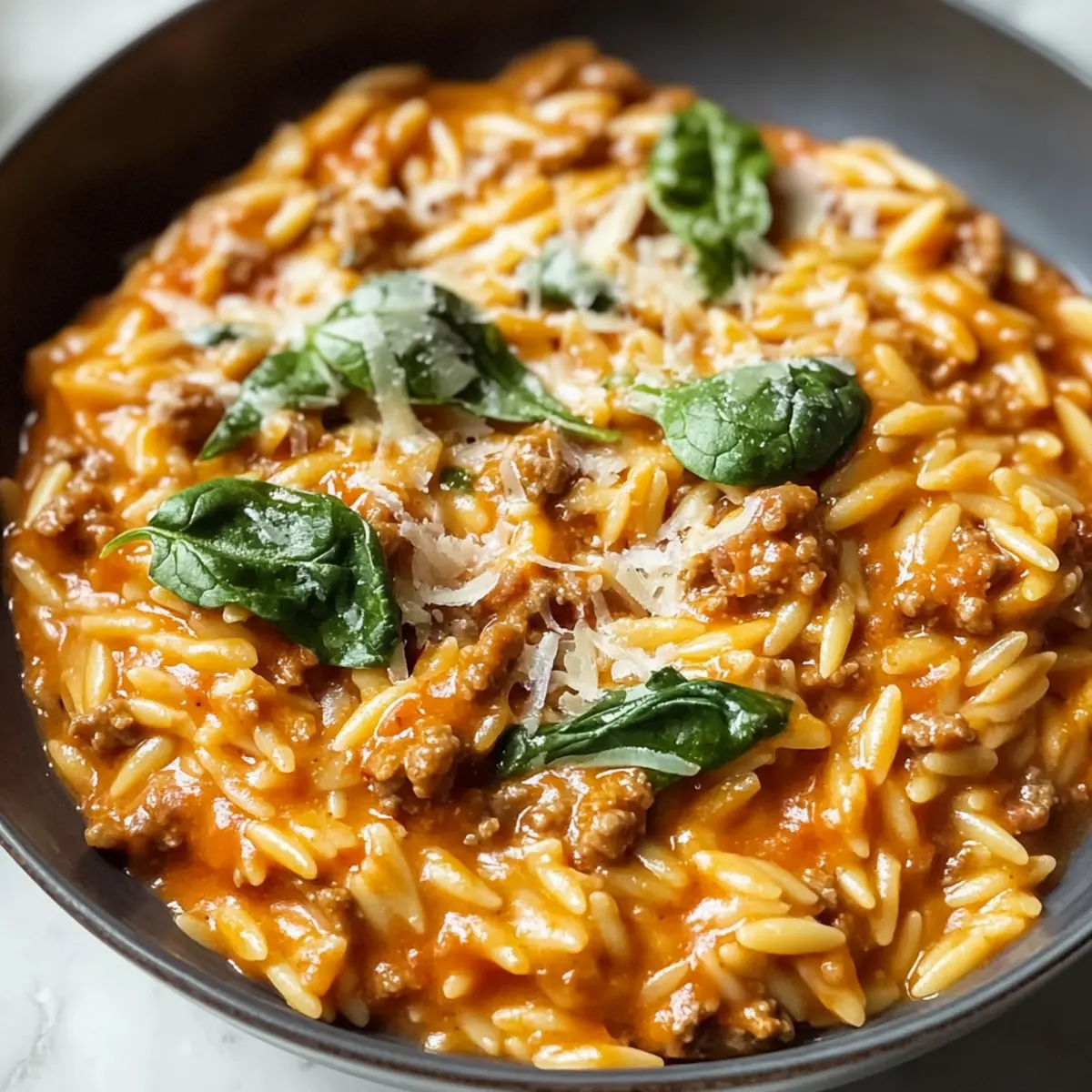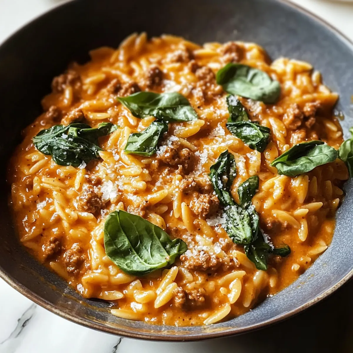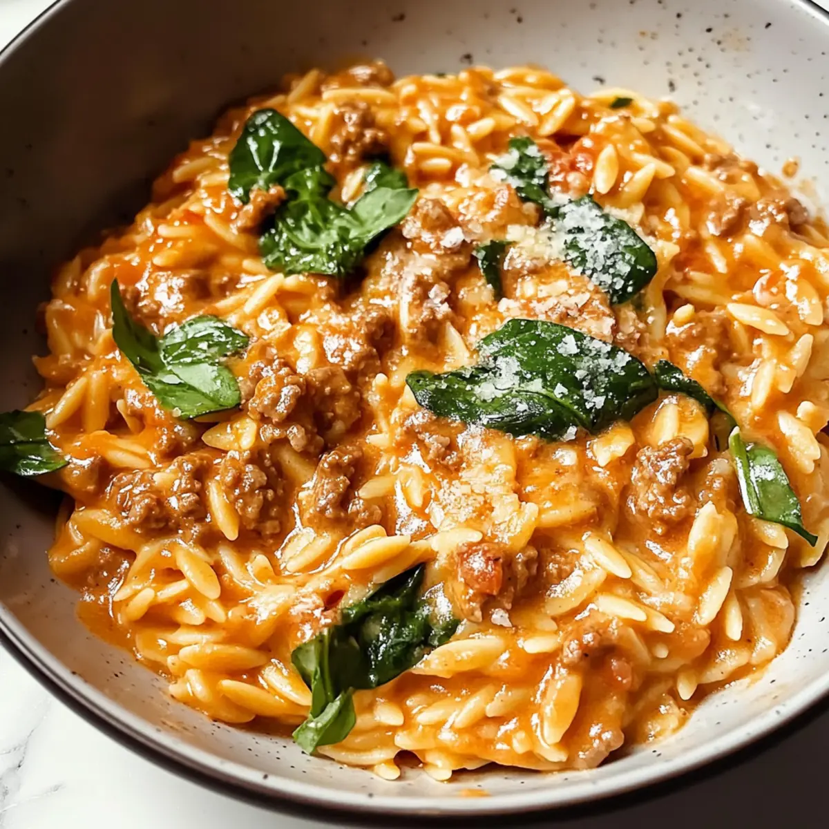 Rinderhackfleisch Orzo mit Tomatenrahmsauce in 30 Minuten