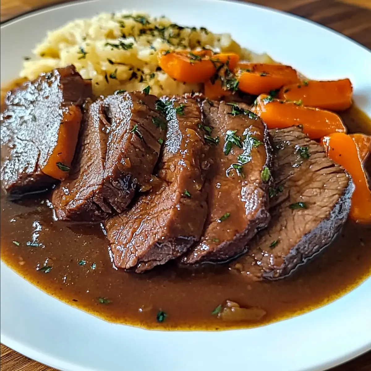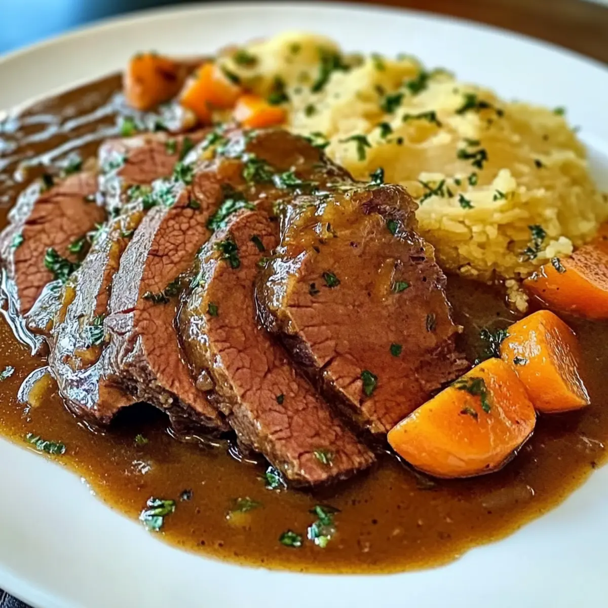 Schneide das zarte Rindfleisch in Scheiben und richte es auf einer großen Platter an. Serviere den Sächsischen Sauerbraten mit der glatten Sauce darüber und ergänze das Gericht mit traditionellen Beilagen wie Kartoffelknödeln oder Rotkohl. Die Kombination von Aromen wird dich und deine Gäste begeistern!
