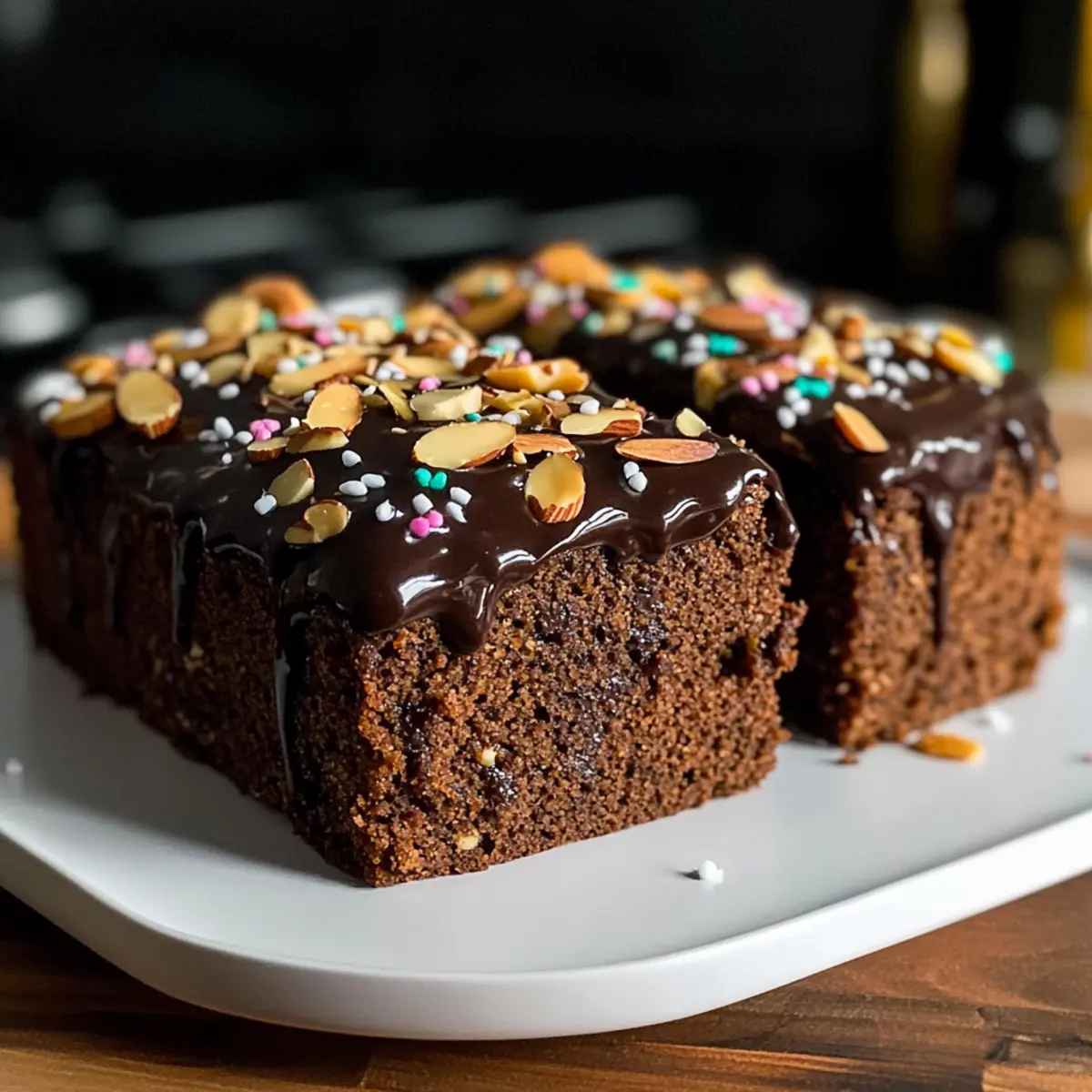 Lassen Sie den Kuchen vollständig abkühlen, wenn Sie ihn in einem Backrahmen gebacken haben; entfernen Sie diesen für eine saubere Kante. Schmelzen Sie Schokolade und zusätzlich etwas Butter zur Glasur und verteilen Sie sie gleichmäßig über den abgekühlten Kuchen. Dekorieren Sie nach Belieben mit Mandelblättchen und Zuckerstreuseln.