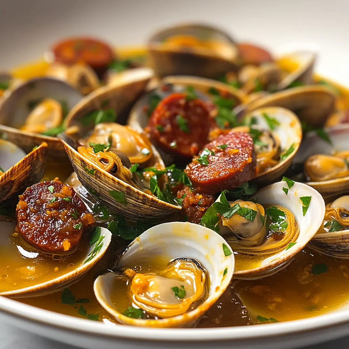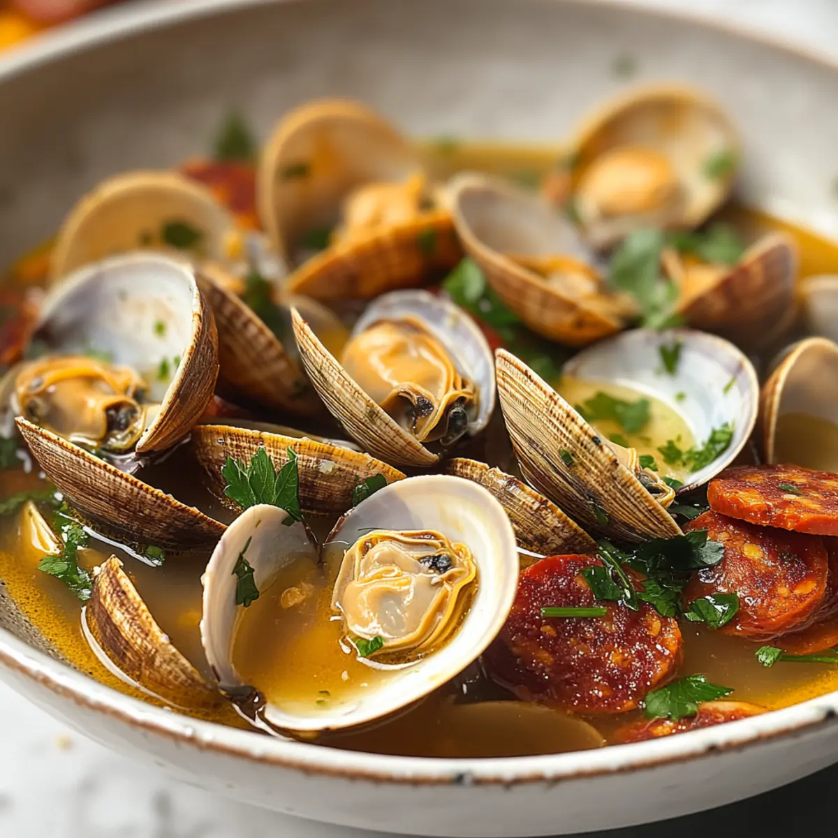 Aromatische Kombination: Der rauchige Chorizo verleiht den Muscheln eine herzhafte Tiefe, während der Sake für eine subtile Süße sorgt.