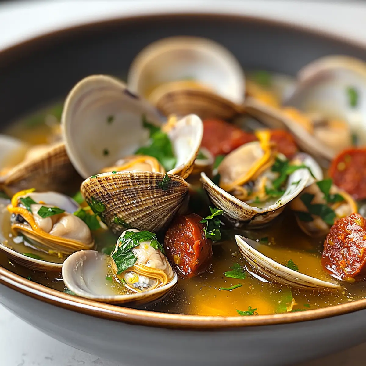 Reinigen Sie die Muscheln gründlich unter kaltem Wasser und entfernen Sie eventuelle Ablagerungen. Achten Sie darauf, dass sie fest geschlossen sind. Schneiden Sie die Chorizo in dünne Scheiben, um das rauchige Aroma zu intensivieren, das später in den Sud übergeht. Diese Vorbereitung ist entscheidend für die Textur und den Geschmack des Gerichts.