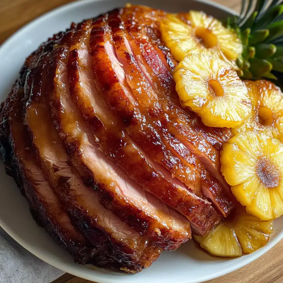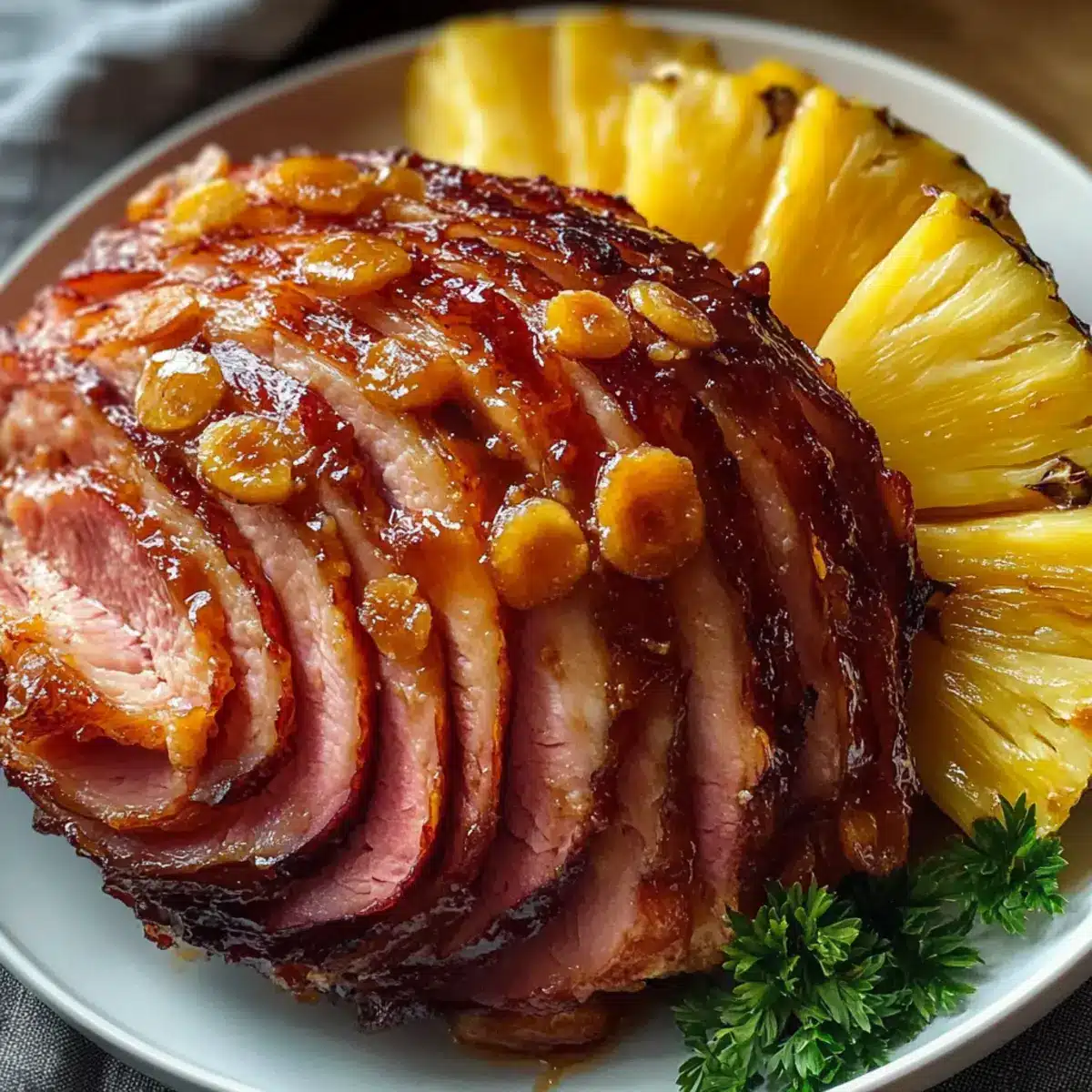 - Gieße die vorbereitete Glasur gleichmäßig über den Schinken und die Ananasscheiben.
