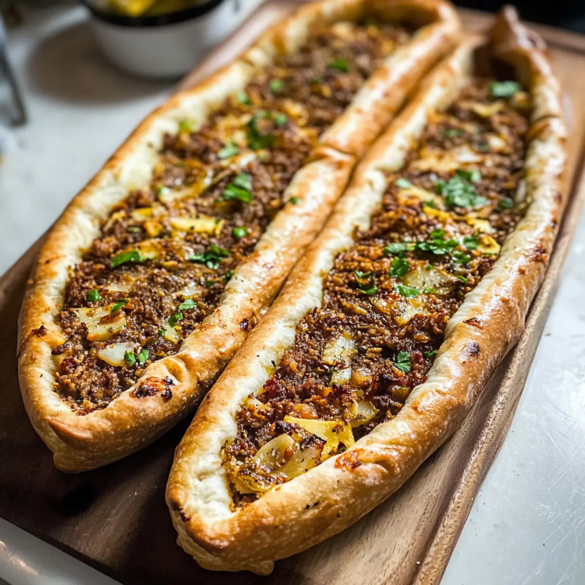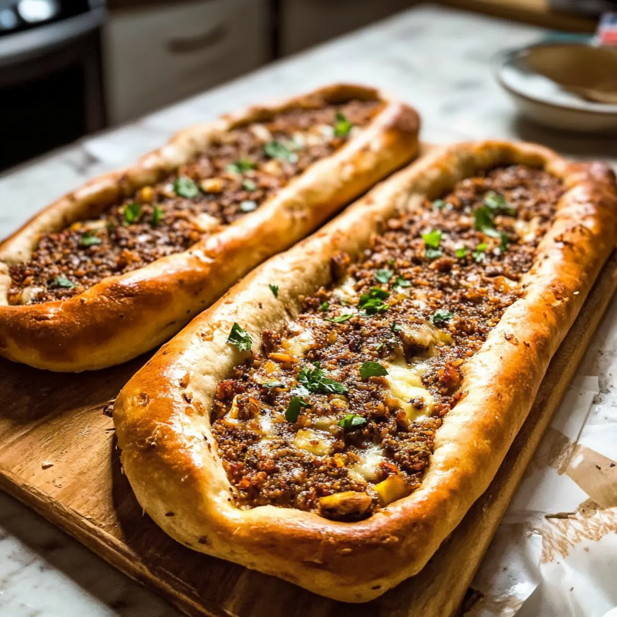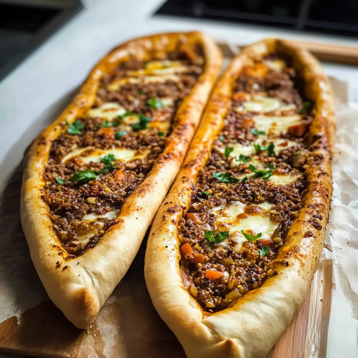 - Lege die vorbereiteten Pide auf ein Backblech oder den vorgeheizten Pizzastein. Backe sie für 14–17 Minuten, bis sie goldbraun und knusprig sind.