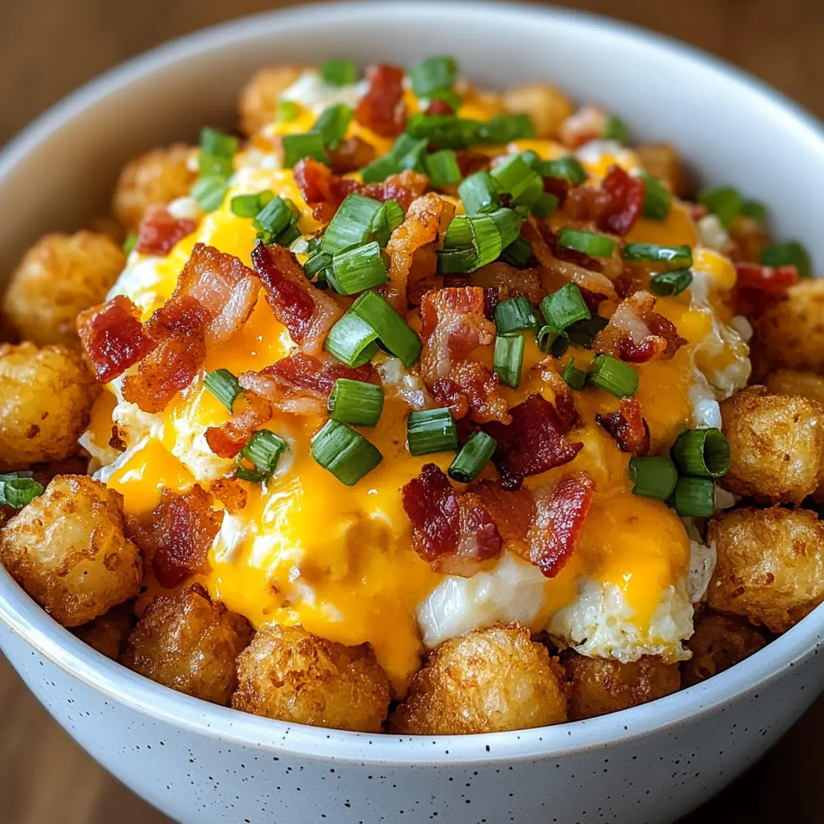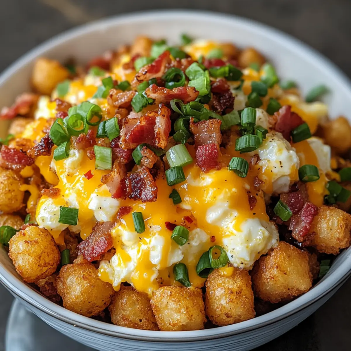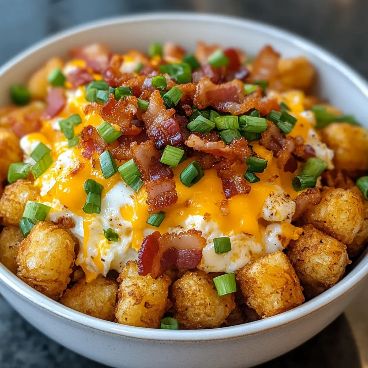 Herzhafter Genuss: Mit einer Kombination aus knusprigen Tater Tots, fluffigen Rühreiern und würzigem Speck ist diese Schüssel ein wahres Geschmackserlebnis.