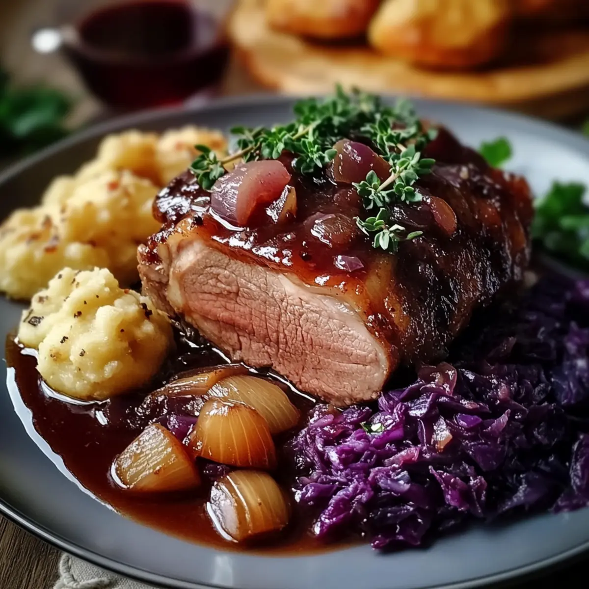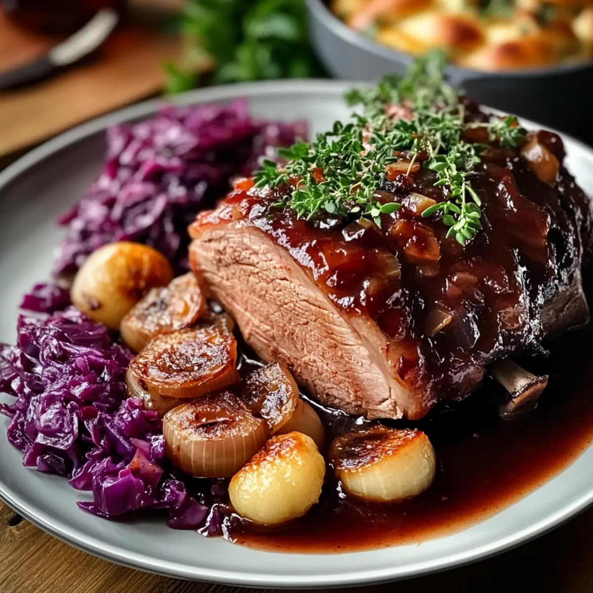Tangy Rotkohl: Der leicht süß-säuerliche Geschmack des Rotkohls bringt Frische und Balance zu dem herzhaften Braten. Er ergänzt die Aromen hervorragend.