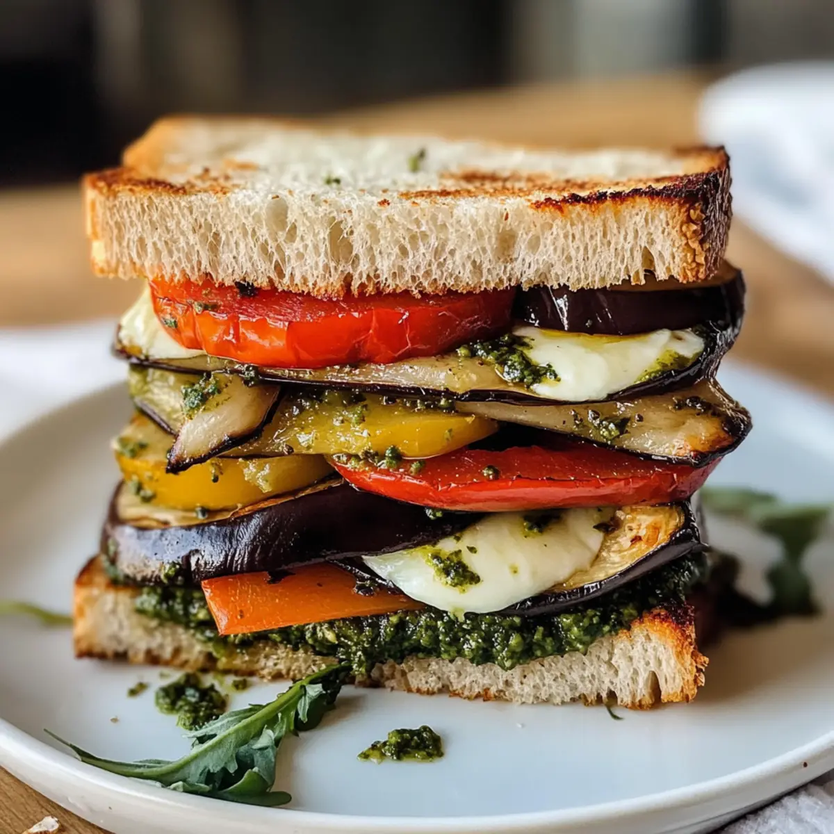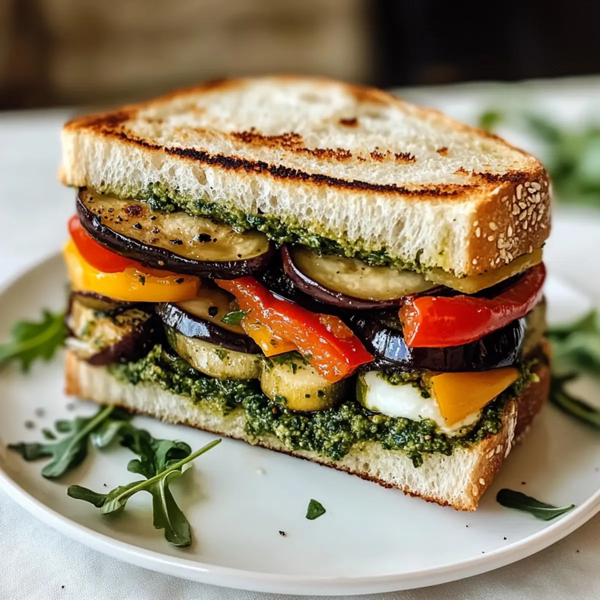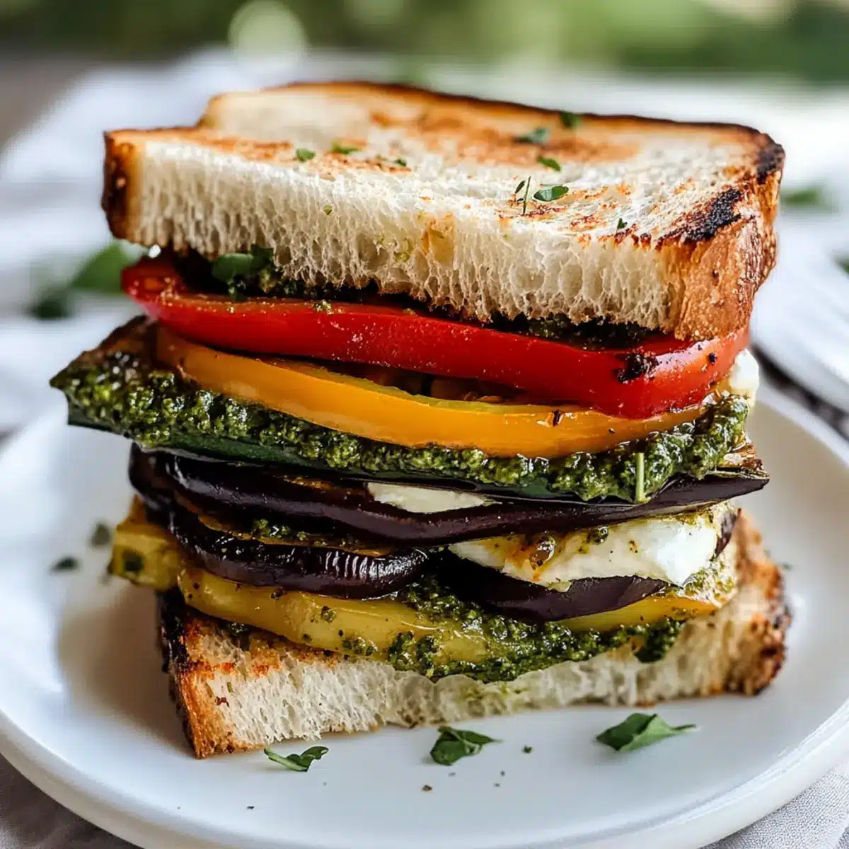 Drücken Sie die Sandwiches vorsichtig zusammen, damit die Schichten gut haften. Lassen Sie die Sandwiches kurz stehen, um die Aromen miteinander verschmelzen zu lassen. Servieren Sie die Sandwiches warm oder wickeln Sie sie ein, um sie später zu genießen. Dieses geröstete Gemüsesandwich wird allen schmecken!